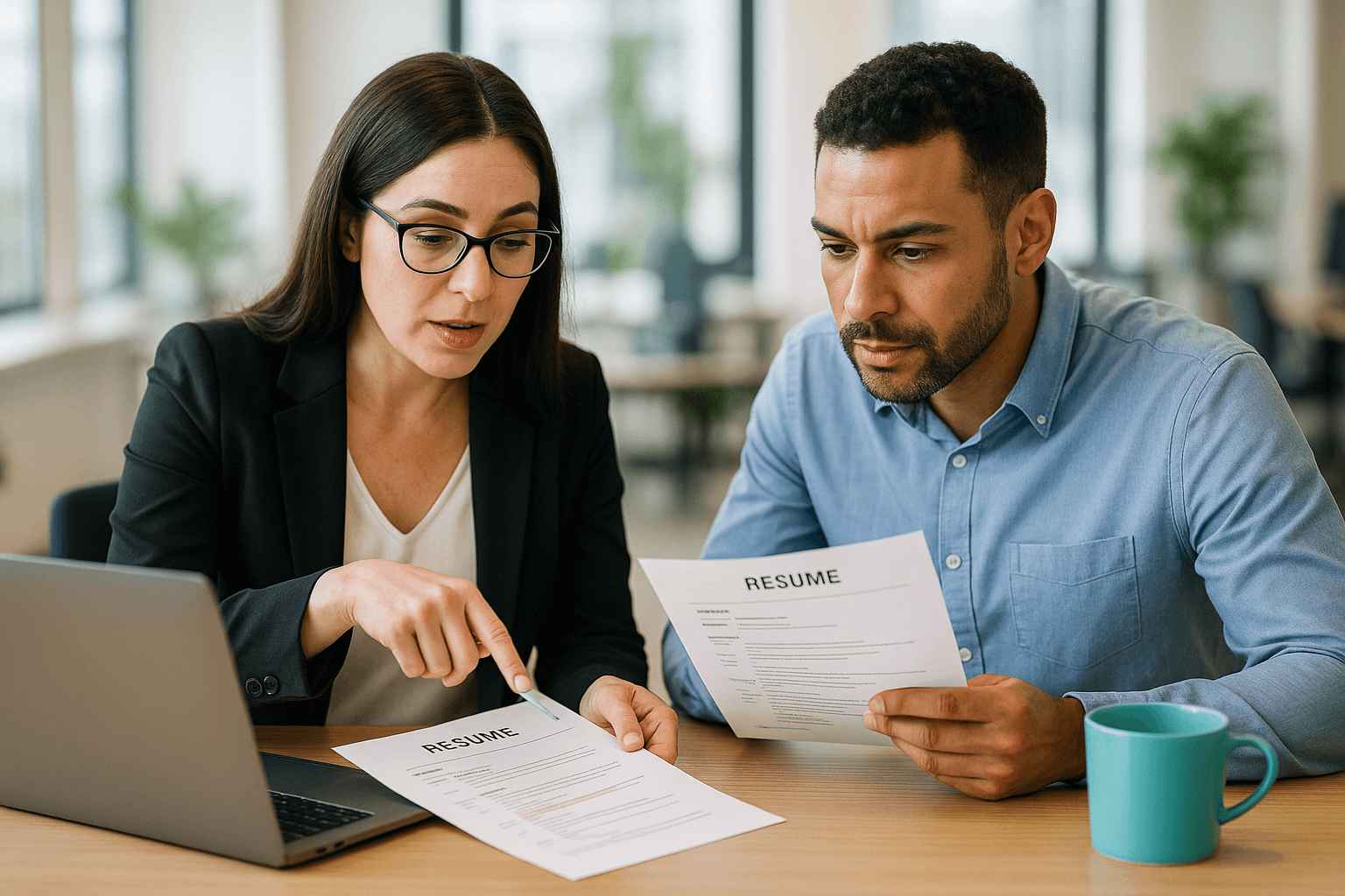 HR manager reevaluating resumes as part of a Retroactive Candidate Evaluation process.